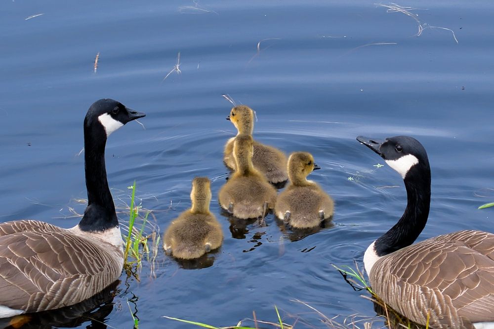Dieses Foto zeigt ein Paar Kanadagänse mit vier jungen Küken, die im Wasser schwimmen.