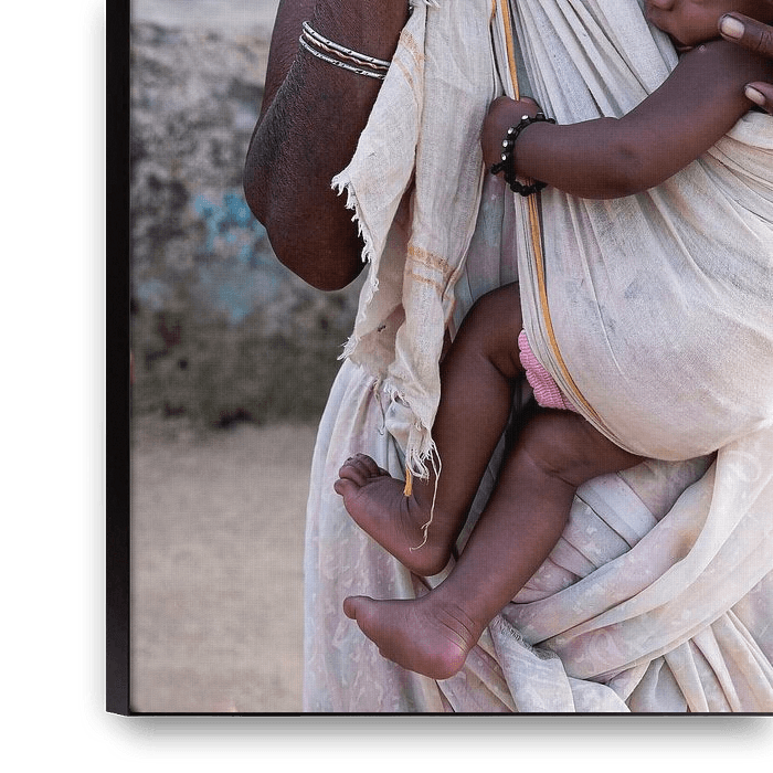 Eine Großmutter trägt das Kind ihrer kürzlich verstorbenen Tochter aus. Ihre Tochter starb bei der Geburt. Sie gehört zu einem der vielen Adivasi-Stämme von Odisha im Osten Indiens. Die Frau gehört zum Stamm der Didayi-Damensel und ist traditionell als Zeichen der Trauer in weiß gekleidet.