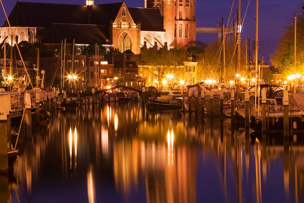 Grote Kerk Dordrecht gespiegelt im Nieuwe Haven. Die Große Kirche oder 'Onze-Lieve-Vrouwekerk' ist ein Wahrzeichen der Stadt. Der Turm der Kirche würde tatsächlich zu einer Turmspitze werden, aber aufgrund von Absenkungen wurde er nie fertiggestellt und ein stumpfer Turm mit einem Uhrwerk darauf gewählt.