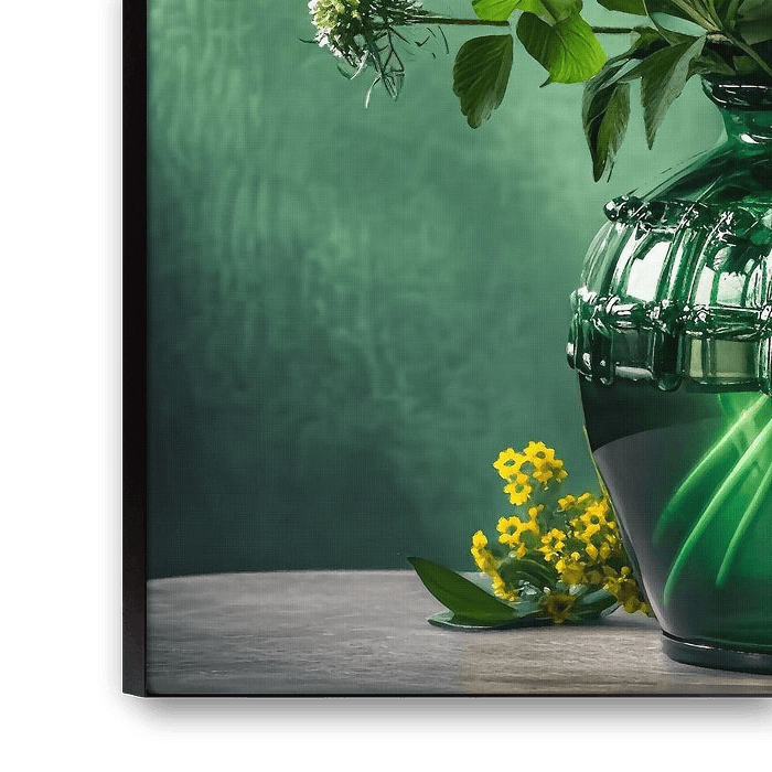 Dieses klassische Gemälde zeigt einen schönen Strauß wilder, weißer und gelber Sommerblumen in einer transparenten grünen Glasvase. Mit realistischen Farben gemalt, strahlt die Szene eine sommerliche Atmosphäre aus. Durch den dunklen Hintergrund kommen die Blumen noch besser zur Geltung. Dieser Blumendruck passt gut zu einem ländlichen und klassischen Wohnstil. Es ist ein schönes und farbenfrohes Stillleben, das die Natur in Ihr Zuhause bringt.