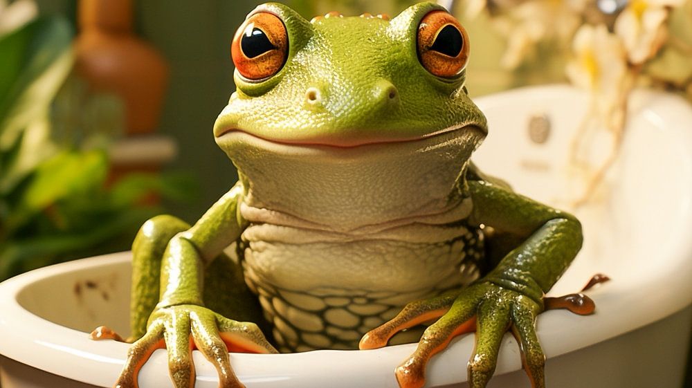 Grüner Frosch sitzt in einer Badewanne