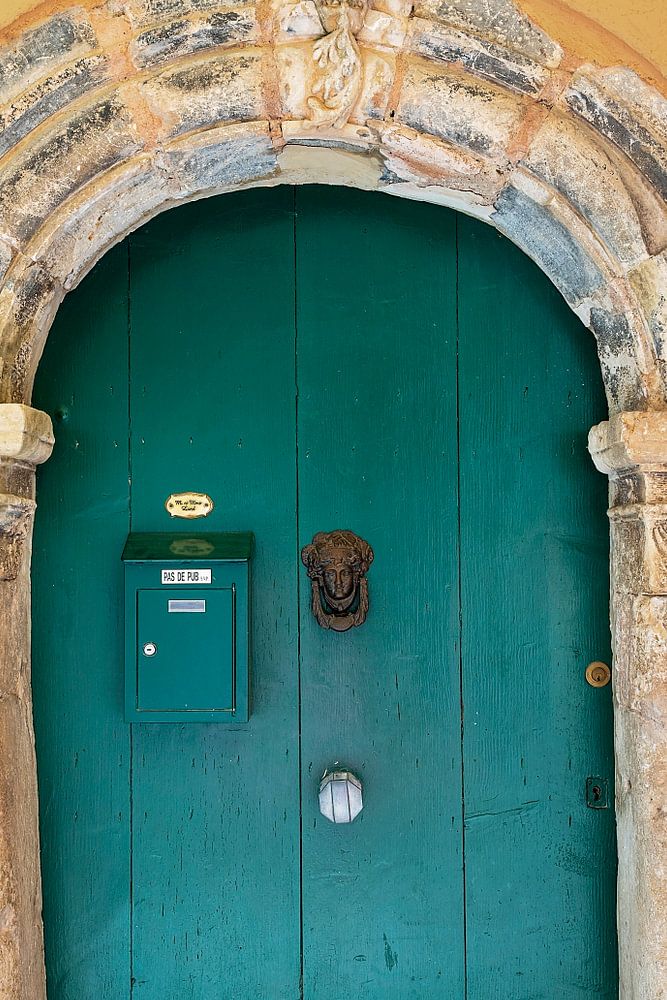 Ich habe diese blaugrüne Tür in Cotignac Frankreich fotografiert. Mir gefiel die Farbe vor der ockergelben Fassade so gut. An der Tür selbst befindet sich ein schöner kupferner Türklopfer in Form eines antiken Kopfes. Hausnummer 2 ist eine mit roten Tulpen verzierte Fliese.
