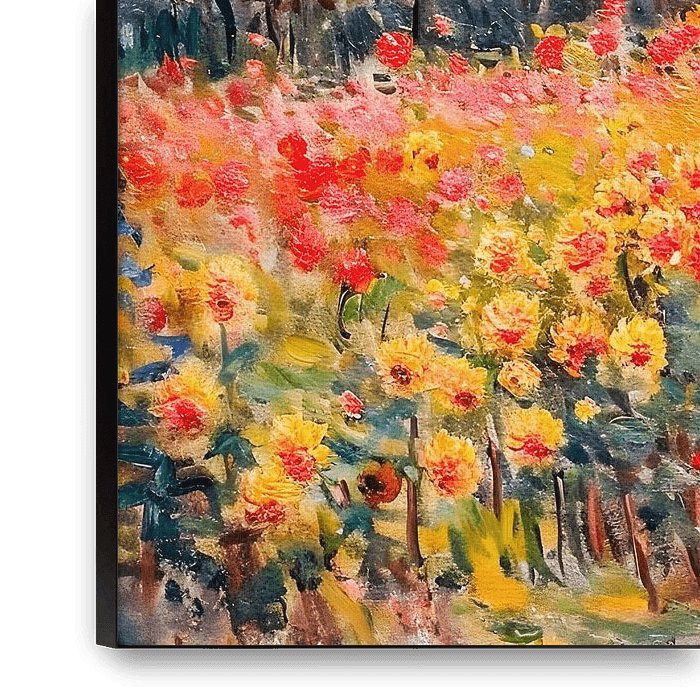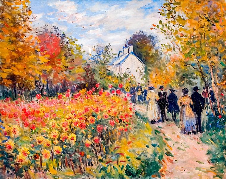 Ein impressionistisches Gemälde, das eine Gruppe zeigt, die durch einen Herbstgarten schlendert, umgeben von bunten Blumen und warmen Herbstfarben.
