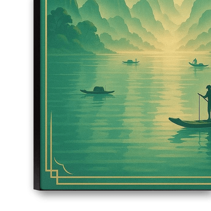 Dieses Kunstwerk fängt die ätherische, traumhafte Schönheit von Guilin ein - eine Landschaft, die Dichter, Maler und Reisende seit Jahrhunderten inspiriert hat. Die Szene zeigt den Li-Fluss, der sich friedlich durch einen Wald hoch aufragender Karstberge schlängelt, dargestellt in sanften Grünabstufungen, die sich in Morgennebel auflösen. Boote treiben ruhig über das ruhige Wasser, jedes von einem einsamen Fischer geführt, was ein Gefühl von zeitloser Ruhe vermittelt.
