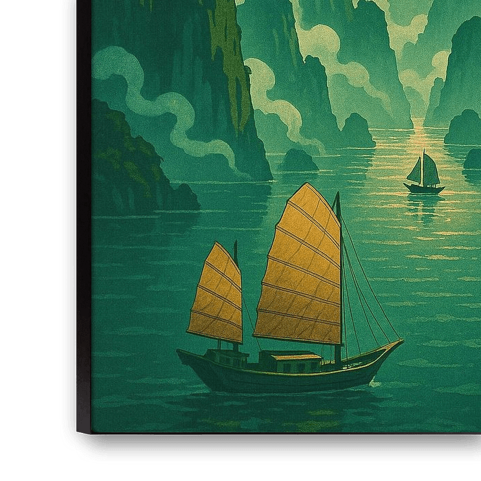 Traditionelle Holzboote gleiten friedlich über das ruhige Wasser, ihre Segel fangen das Sonnenlicht ein, während sie sich durch die legendäre Meereslandschaft bewegen. Das Gleichgewicht zwischen dramatischen Klippen und sanften Reflexionen schafft eine harmonische, traumhafte Atmosphäre. Das Kunstwerk vermittelt die Ehrfurcht, die Reisende empfinden, wenn sie durch die zahllosen Kalksteininseln der Ha Long Bay navigieren - ein Gefühl des Staunens, das von der Zeit unberührt zu sein scheint.