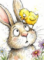 Ein süßes Häschen schaut überrascht, als ein Küken auf dem Kopf steht.