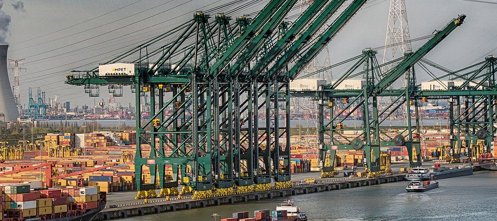Panoramablick aus Kranhöhe über den Hafen von Antwerpen