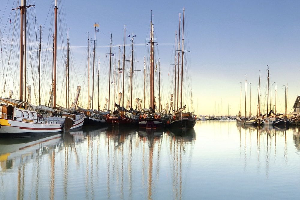 Hafen von Volendam bei Sonnenaufgang während der jährlichen Pieperrace