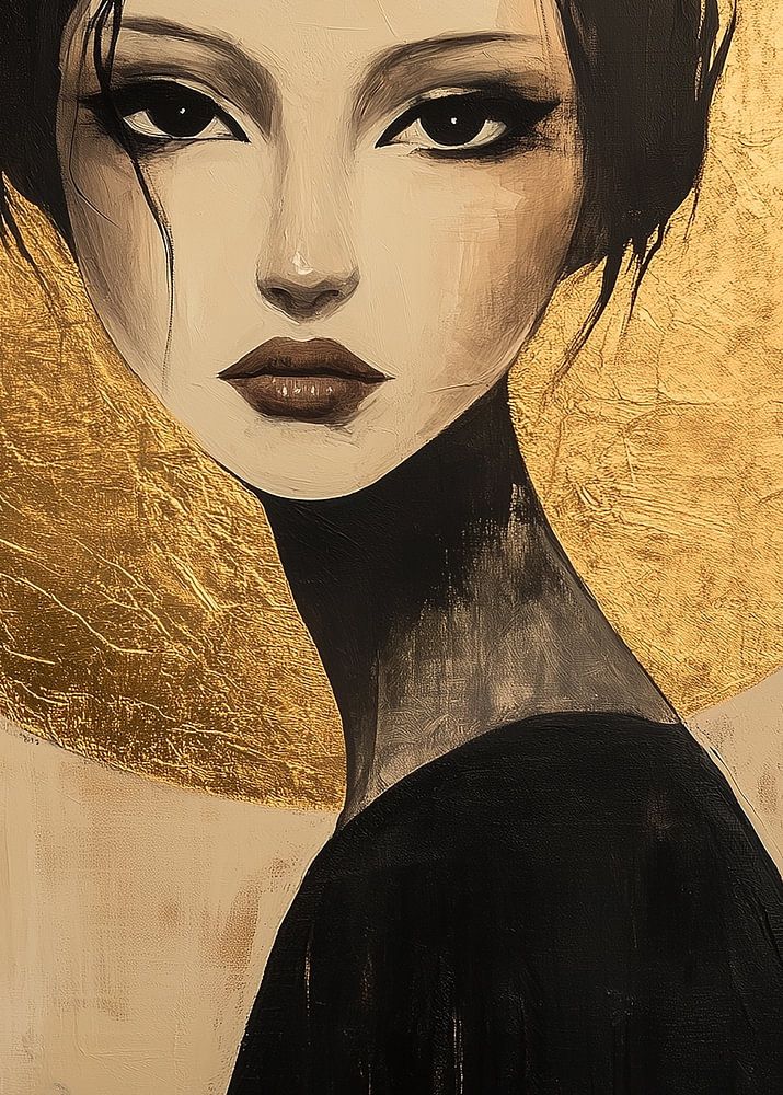 Eine elegante Frau mit heiterem Blick ist mit einem goldenen Kreis um ihren Kopf dargestellt, der an einen Heiligenschein erinnert. Ihr schwarzes Haar ist stilvoll hochgesteckt und unterstreicht ihre Gesichtszüge. Sie trägt ein minimalistisches schwarzes Kleid, das sich von dem zartbeigen Hintergrund abhebt. Ihre Haut und ihr Gesicht sind in warmen Beigetönen gehalten, wodurch eine harmonische und gedämpfte Farbpalette entsteht. Die Komposition strahlt Ruhe und Mystik aus, wobei der goldene Kreis ein subtiles, aber kraftvolles visuelles Element darstellt.