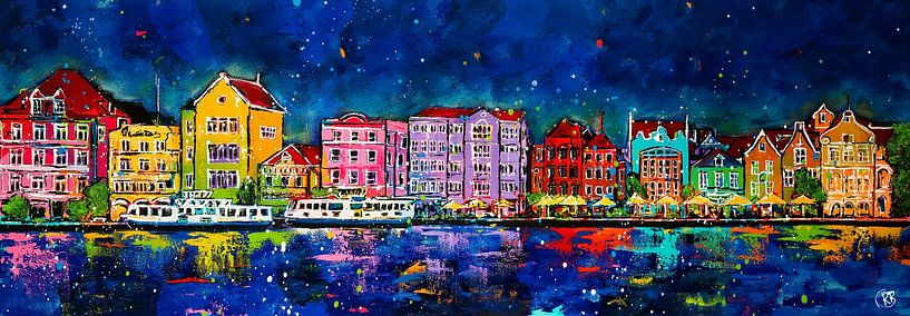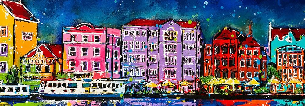 Handelskade bei Nacht in Curaçao von der Künstlerin Renate Rolefes. Das Originalgemälde ist 200 x 70 groß und mit Acrylfarbe gemalt.
