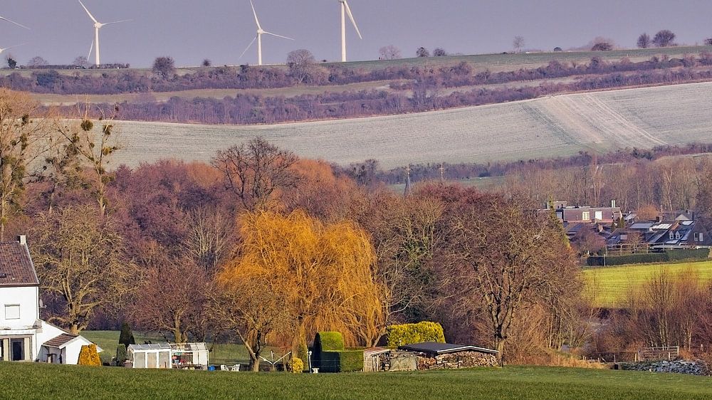 Das Südlimburger Hügelland im Dreieck Lemiers, Holset, Vijlen an einem Wintertag mit Blick auf die Windmühlen an der deutschen Grenze zu den Niederlanden bei Bocholtz.