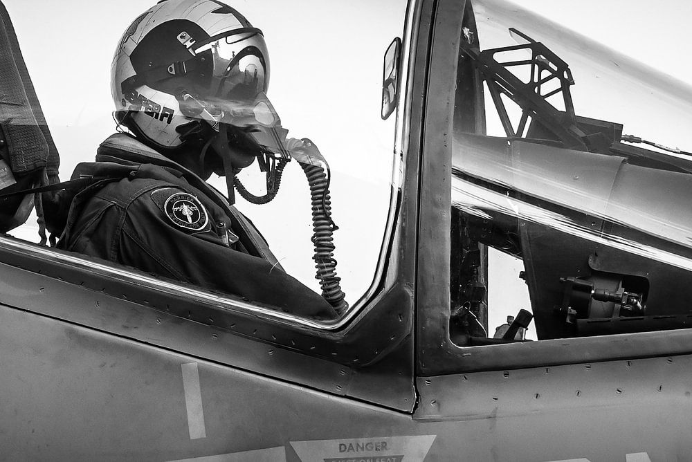 Ein Pilot an Bord eines McDonnell Douglas AV-8B Harrier II-Kampfflugzeugs ist abflugbereit. Der McDonnell Douglas AV-8B Harrier II wird von der spanischen Marine eingesetzt und ist ein vertikal und/oder kurz startender und landender Jäger.