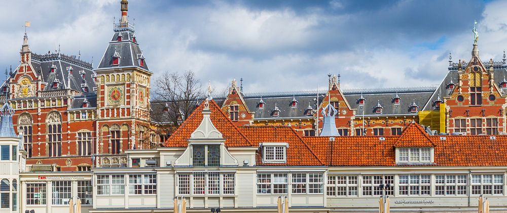 Cafe Restaurant Loetje und der Hauptbahnhof in Amsterdam. Die Ausflugsboote von Lovers, die Touristen auf den Kanälen von Amsterdam segeln.