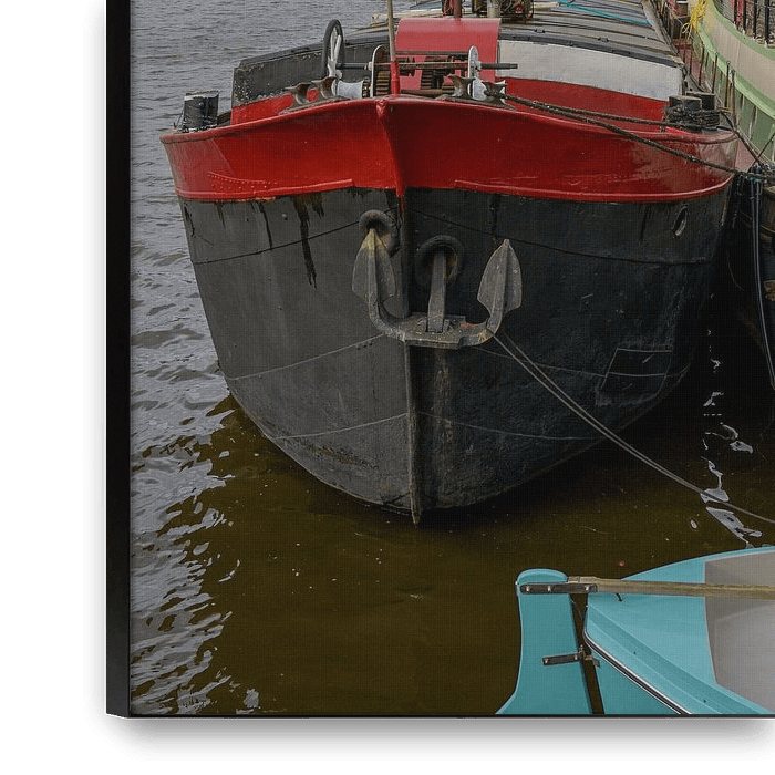 Direkt neben der Skinny Bridge in Amsterdam liegen 2 Hausboote doppelt in der Amstel vertäut. Ein geschäftiger, aber auch einzigartiger Ort zum Leben! Die leuchtend farbigen Paspeln in antikem Rot und die andere in hellem Grün sowie das frisch gefärbte blaue Ruderboot im Vordergrund geben diesem Werk eine besondere Note.