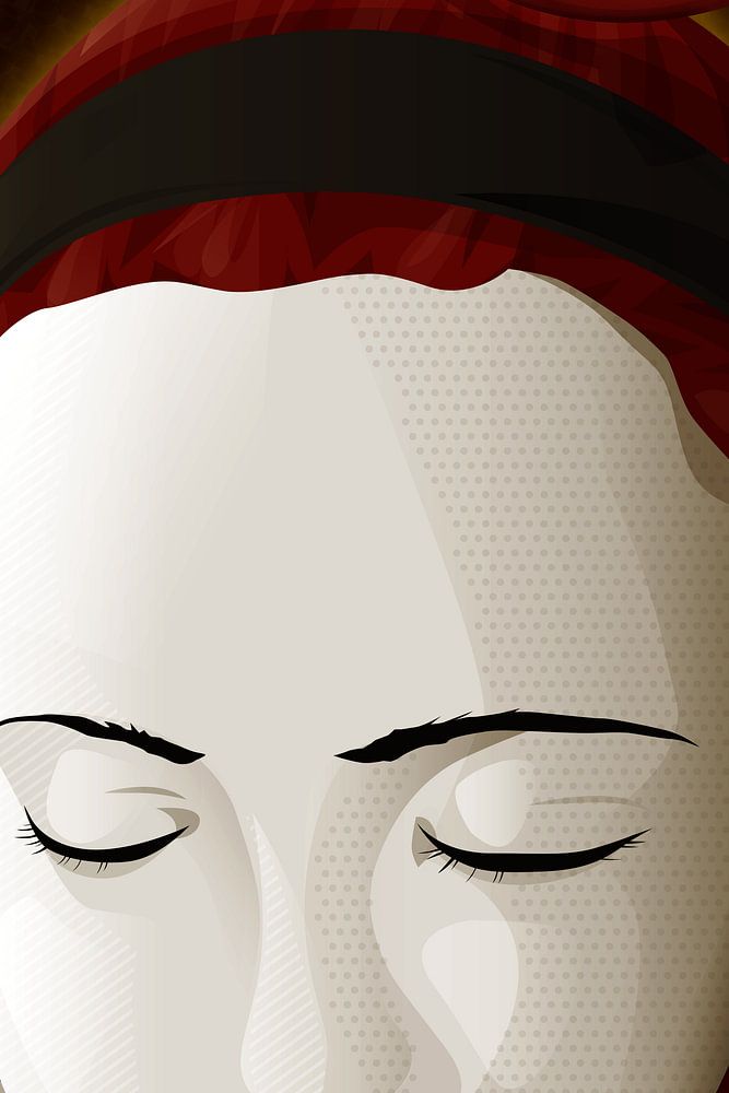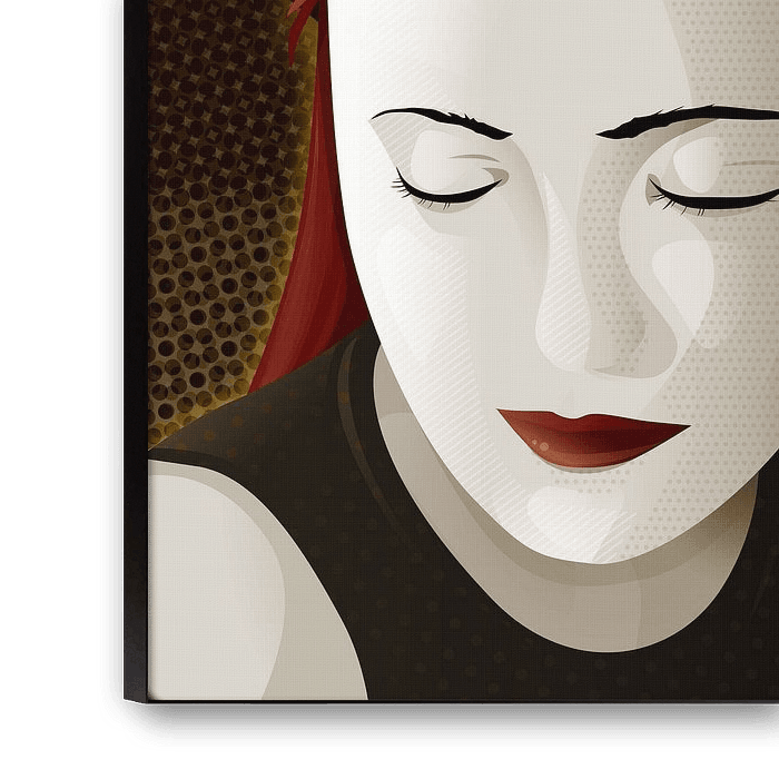 Das Werk „Heilige Maria“ zeigt eine stilisierte Frauenfigur mit Heiligenschein, umgesetzt als Vektorgrafik mit klarer Formsprache und texturiertem Hintergrund. Die Figur trägt ein schwarzes Oberteil, das Gesicht bleibt bewusst unscharf – eine Entscheidung, die Anonymität und Projektion ermöglicht. Auffällig ist ein rotes Band, das sich um den Heiligenschein windet und nach unten fällt – ein visuelles Detail, das Spannung erzeugt und Interpretationsspielraum bietet.