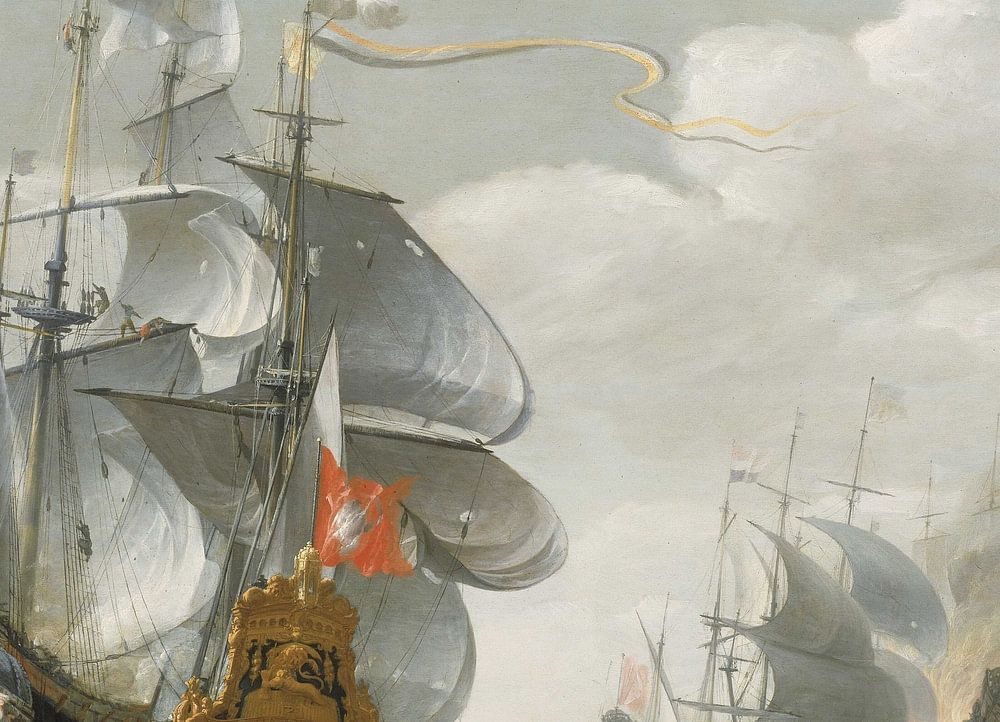 Dieses Gemälde wurde wahrscheinlich kurz nach der Schlacht gemalt und zeigt das Gefecht zwischen der 'Royal Charles' und der 'Eendracht' aus der niederländischen Perspektive. Der linke Vordergrund wird von den duellierenden Flaggenschiffen der beiden Oberbefehlshaber beherrscht. Links liegt die 'Royal Charles' mit dem Herzog von York an Bord und dem königlichen Wappen am Heck. Ein kleines Boot ist durch ein Seil mit dem Schiff verbunden, das von zwei Männern gehalten wird, und weitere Männer arbeiten in der Takelage. Aus nächster Nähe ist rechts die Eendracht mit dem geschnitzten Löwen am Heck zu sehen, der die niederländische Flagge und die Flagge kurz vor der Explosion schwenkt. Das englische Flaggschiff "Royal Charles" hat auf dem Gemälde fälschlicherweise ein holländisches Heck mit einer quadratischen Falte und einer Galerie.