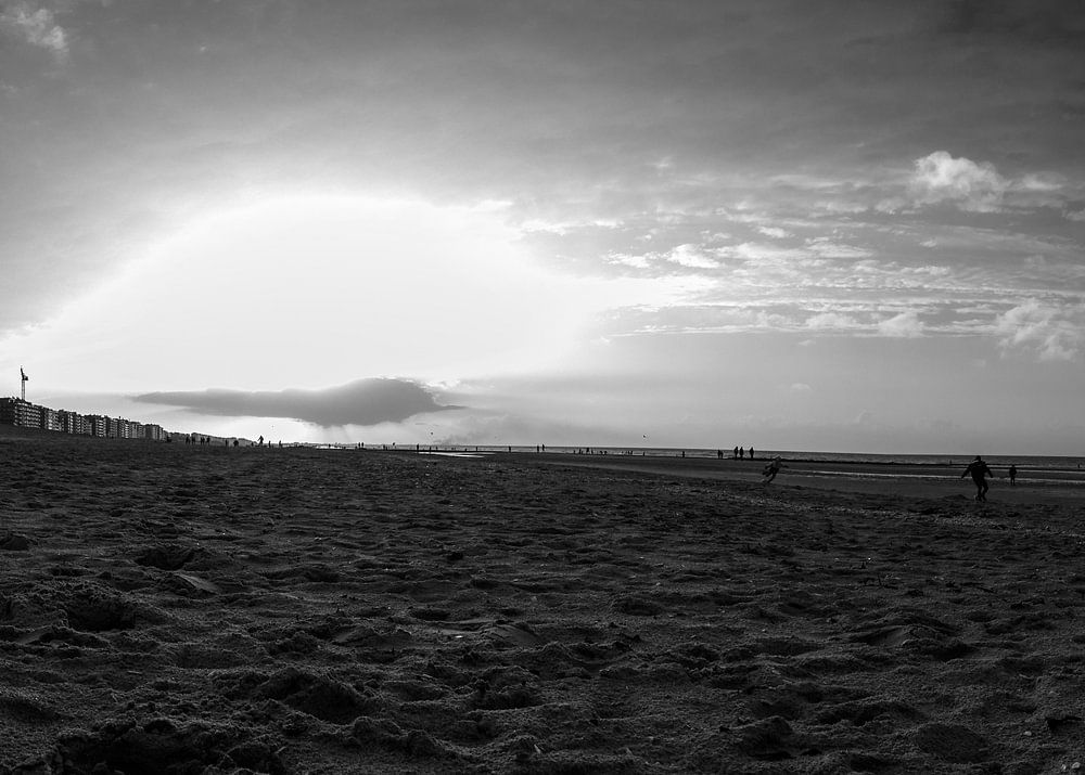 Herbstsonnenuntergang von einem niedrigen Aussichtspunkt am Strand von Koksijde mit goldenem Licht und Menschen am Strand, die in schwarz-weiß spielen