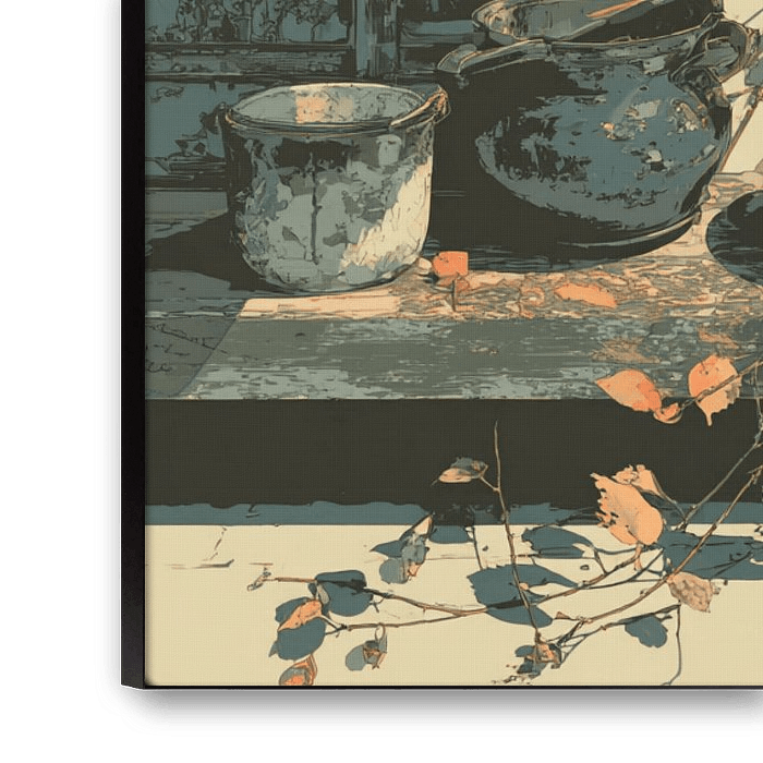 Das Bild präsentiert ein melancholisches Stillleben, geprägt von klaren Linien und gedämpften Farbtönen. Auf einer rustikalen Holzbank arrangieren sich verwitterte Töpfe und Gefäße in dunklen, fast monochromen Nuancen. Eine spärliche Kletterpflanze mit leuchtend orangefarbenen Herbstblättern durchbricht die Tristesse und fängt die dramatischen Schatten eines schräg einfallenden Sonnenstrahls ein. Die Szene strahlt eine ruhige, aber leicht verlassene Atmosphäre aus, akzentuiert durch die Textur der rauen Wand und der abblätternden Farbe. Es ist eine Gratwanderung zwischen Vergänglichkeit und poetischer Schönheit.