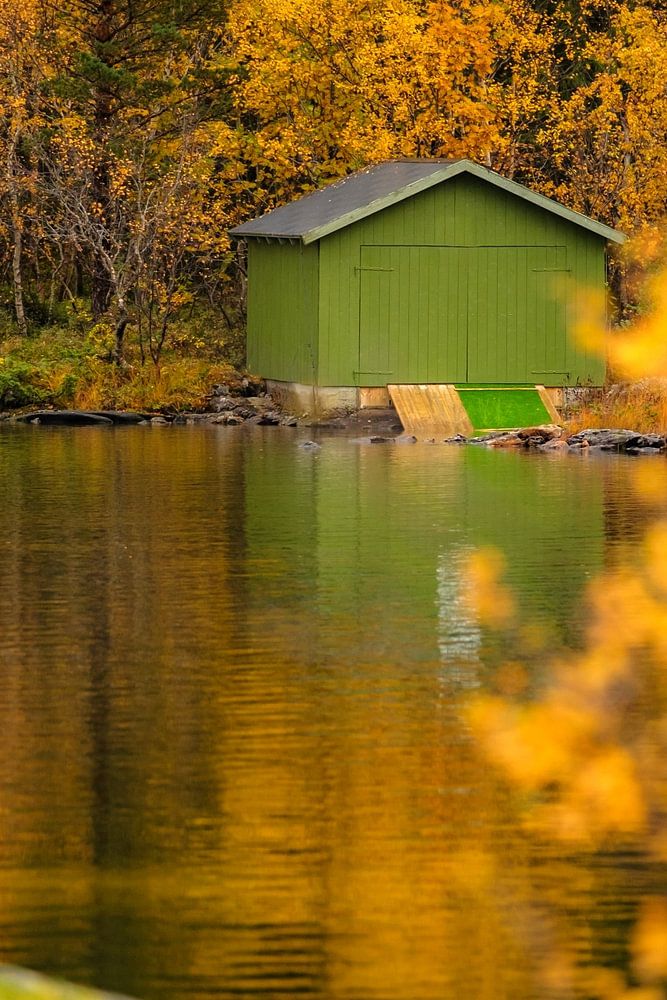 Der Herbst ist eine fantastische Zeit, um Norwegen zu erkunden, denn dann verwandeln sich die Wälder und Täler in ein malerisches Schauspiel aus leuchtenden Farben. Für Fotografen ist dies eine besonders inspirierende Zeit, in der jeder Winkel und jedes Detail der Landschaft in warme Farbtöne gehüllt ist. Das grüne Fischerhäuschen inmitten der herbstlichen Bäume ist ein idyllisches Bild, das die ursprüngliche Schönheit des norwegischen Herbstes perfekt einfängt. Für Naturliebhaber und Reisende ist diese Jahreszeit in Norwegen eine wahre Entdeckung, denn hier treffen Herbstfarben, Ruhe und Natur pur aufeinander.