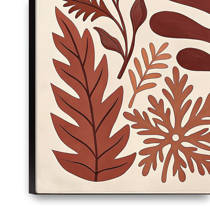 Dieses Kunstwerk fängt die Essenz des Herbstes mit seiner reichen Palette an erdigen Braun-, Rot- und gedämpften Orangetönen ein. Die stilisierten Blätter, die an die Scherenschnitte von Matisse erinnern, schaffen ein Gefühl von organischem Rhythmus und Gleichgewicht. Die Komposition erweckt ein Gefühl der Ruhe und der Schönheit des…