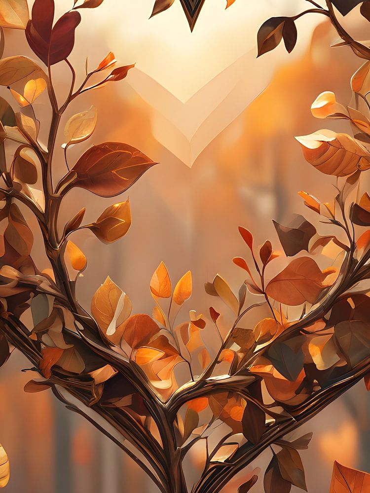 Dieses Bild zeigt eine Herbstszene, in der Zweige und Blätter anmutig eine Herzform bilden. Die warmen, orangefarbenen und braunen Töne der Blätter schaffen eine intime und beruhigende Atmosphäre, die sich perfekt für eine Herbstdekoration eignet. Der Kunststil enthält Elemente des Naturalismus und des Surrealismus, wobei der Schwerpunkt auf Details in den Blättern und Zweigen liegt, die eine fast magische Harmonie ausstrahlen. Die weiche Beleuchtung und die subtilen Schatten in dem Werk schaffen ein Gefühl von Tiefe und Raum, wodurch es lebendig und einladend wirkt.