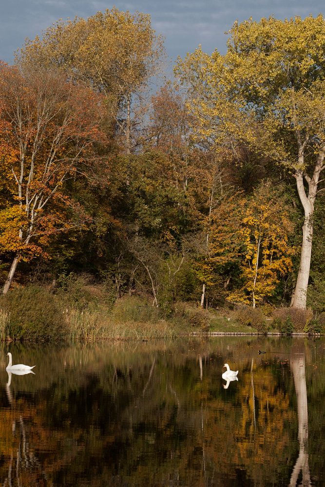 Ein Stilleben aus zwei Bäumen und zwei Schwänen in der Brouwerskolk in Overveen. Aufgrund der Jahreszeit und der Tageszeit sind die Farben wunderschön satt.