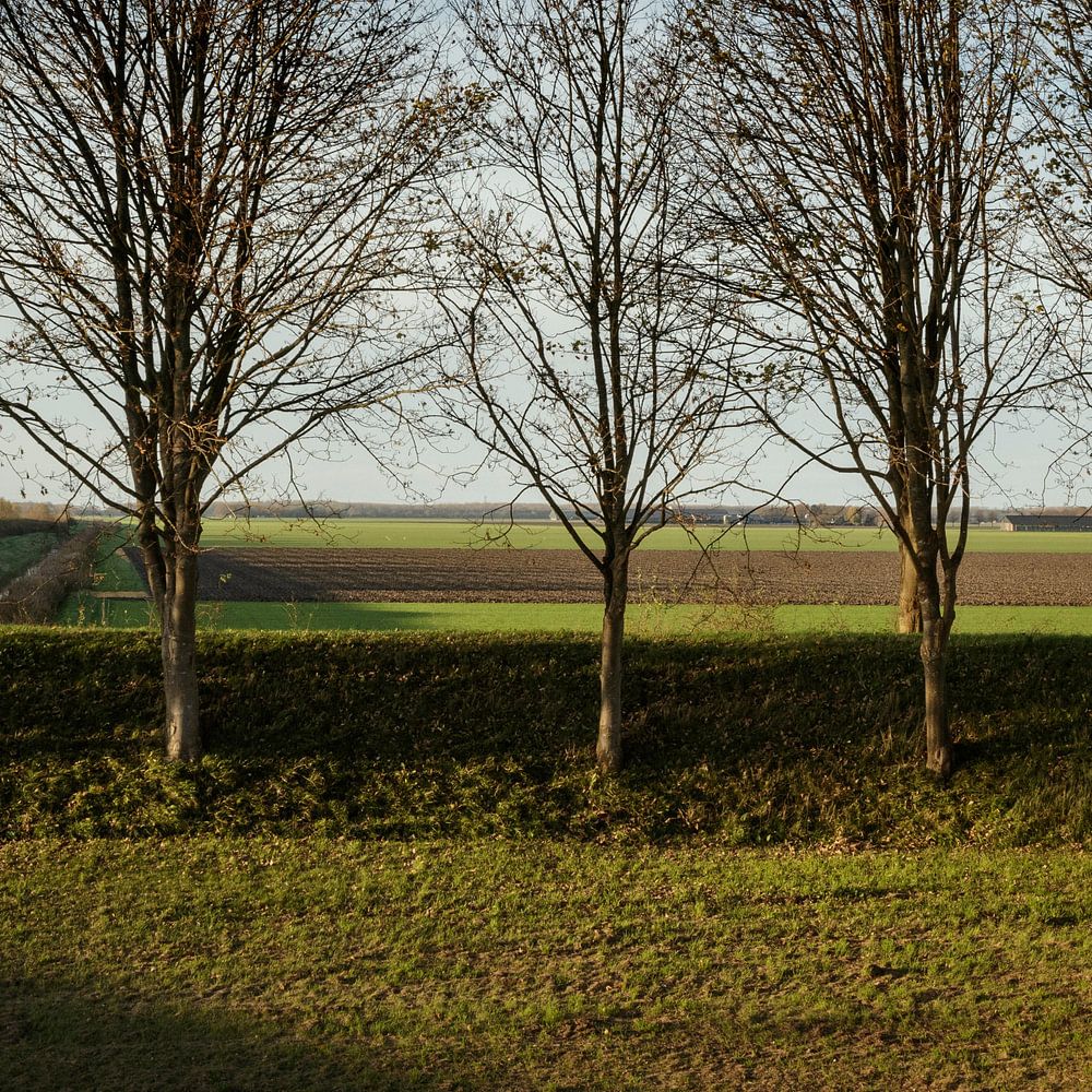 Bäume, Deiche, Wasser, Felder und blauer Himmel in Flevoland an einem blauen, klaren Tag kurz vor Sonnenuntergang