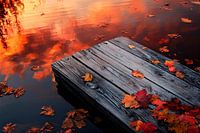 Ein ruhiger Holzsteg schimmert im warmen Licht des Sonnenuntergangs, während bunte Herbstblätter sanft auf die Wasseroberfläche gleiten. Die Reflexion des Himmels schafft eine harmonische Atmosphäre der Ruhe und Besinnlichkeit. Dieses Bild verleiht jedem Wohnzimmer ein Gefühl von Naturverbundenheit und Entspannung, ideal für Momente der…