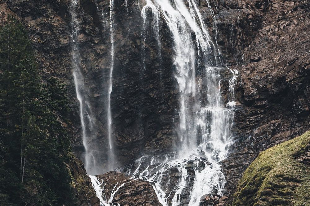 Ein schöner Wasserfall in den Schweizer Alpen im Herbst. Die Alpenregion der Schweiz, die gemeinhin als Schweizer Alpen bezeichnet wird, stellt eine wichtige natürliche Besonderheit des Landes dar und ist zusammen mit dem Schweizer Mittelland und dem Schweizer Teil des Juras eine der drei wichtigsten physiografischen Regionen.
