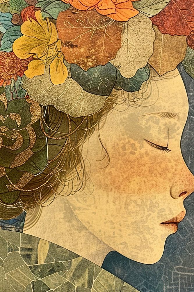 Details: Frau, Portrait, Blumen, Herbst, Kunst, orange, rot, braun, blau, grün
