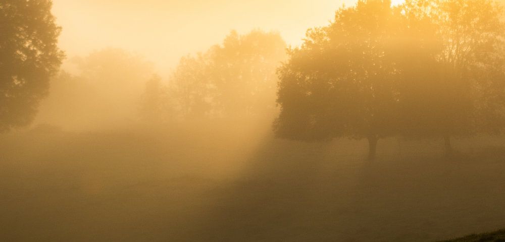 Dies ist die einzigartige Szene der aufgehenden Sonne im November. Die Hintergrundbeleuchtung sorgt durch den Nebel und das orangefarbene Leuchten für viel Atmosphäre. Die Silhouetten der Bäume sind wunderschön präsentiert.