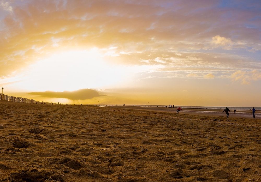 Herbstsonnenuntergang von einem niedrigen Aussichtspunkt am Strand von Koksijde mit goldenem Licht und spielenden Menschen am Strand