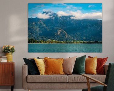 Blick über den Forggensee zu Hornburg und Branderschrofen an einem Tag im Herbst