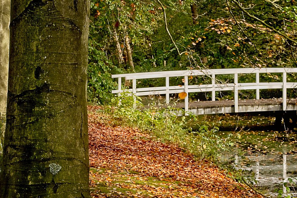 Herbstliche Atmosphäre mit schönem Licht und einer verspiegelten Brücke.