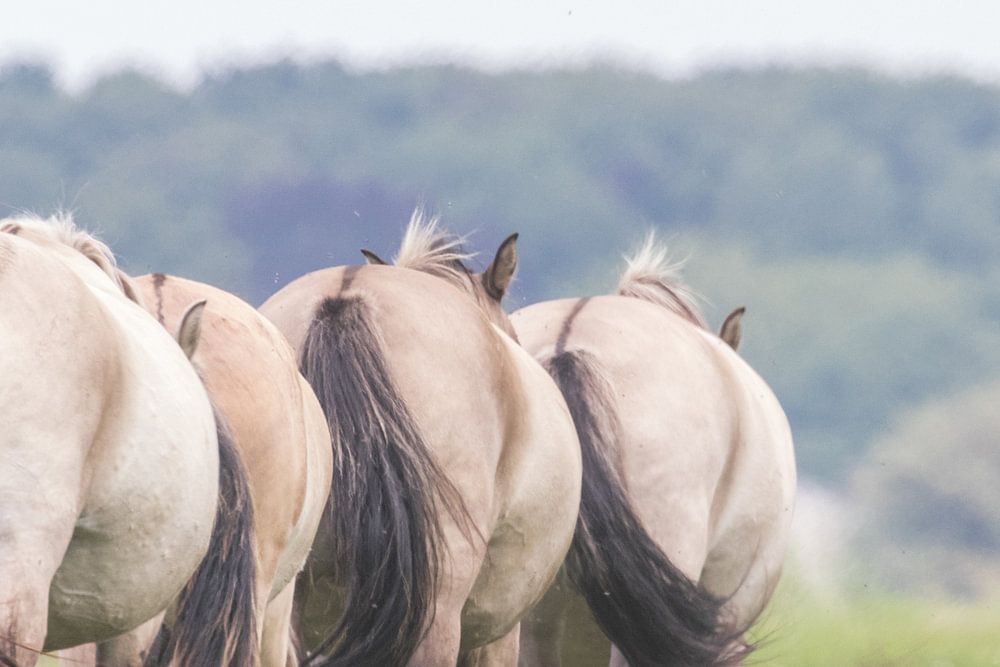 Herde von Koniks in einem Zug auf dem Weg zum Wasser. Aufgenommen im schönen offenen Dünengebiet Lentevreugd, zwischen Wassenaar und Katwijk.