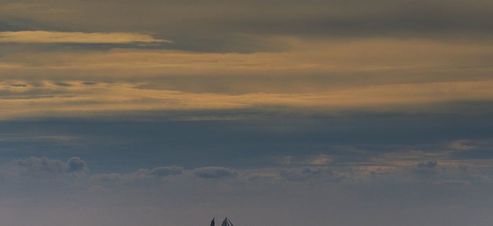 Blik op het IJsselmeer vanaf de haven van Laaxum met een zeilschip tussen de twee dukdalfen in.