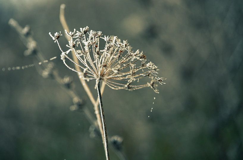 Nahaufnahme einer wild wachsenden Pflanze in der Nähe des Überschwemmungsgebiets des Nederrijn in Heteren, an der Betuwe in Gelderland. Die Pflanze ist mit einer dünnen Schicht Raureif bedeckt und das Foto ist in natürlichen Erdtönen gehalten.