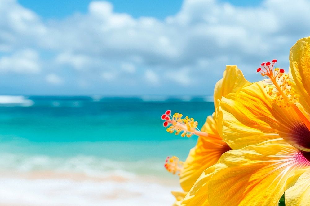 Lebendige Gelbtöne der Hibiskusblüte verschmelzen mit dem strahlenden Blau des Meeres und der schimmernden Küste, was ein Gefühl von Urlaubsstimmung und Entspannung hervorruft. Diese tropische Szenerie eignet sich perfekt für das Wohnzimmer, um einen Hauch von Sommer und Natur in denAlltag zu bringen.