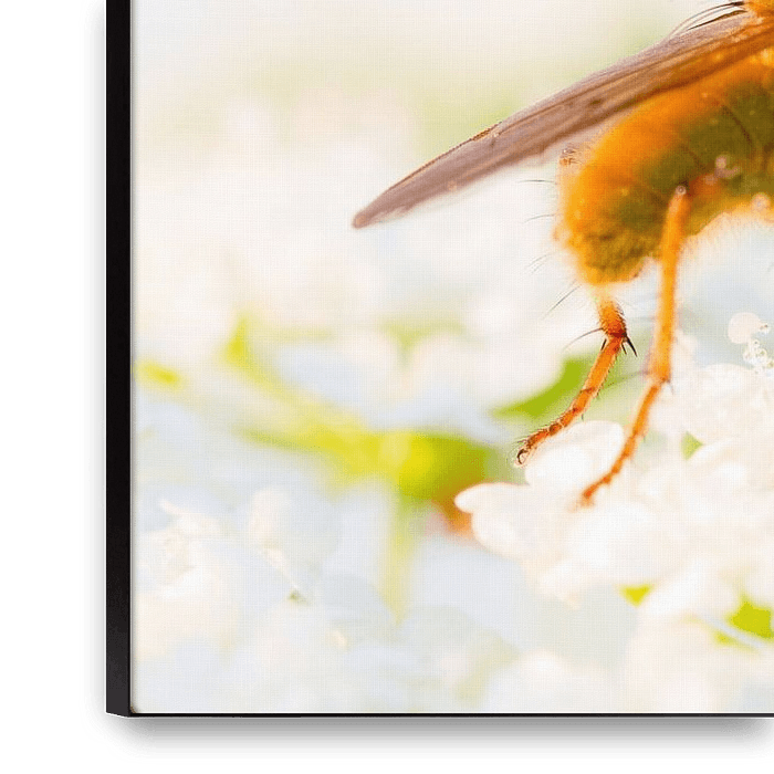 Die frühe Morgensonne beleuchtet diese Scheißfliege warm. Der Schwerpunkt liegt auf der Fliege; der Rest ist komplementär, ohne durch die High-Key-Technik zu stören.