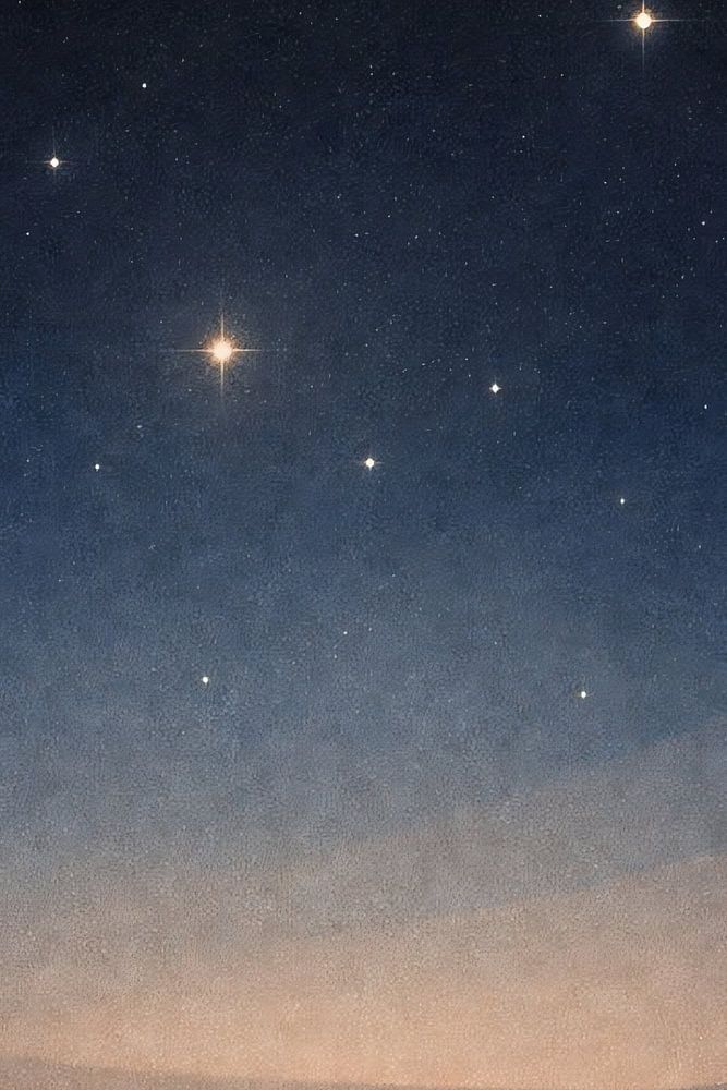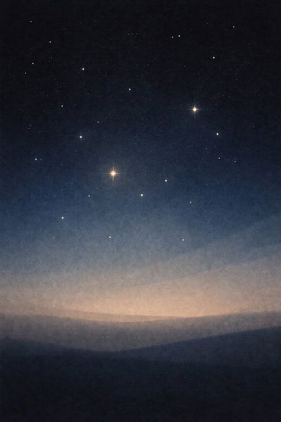 Dieses Kunstwerk fängt einen ruhigen Himmelshorizont ein, an dem ein sternenreicher Nachthimmel sanft in eine warme, leuchtende Dämmerung übergeht. Sanfte Farbverläufe aus tiefem Blau, gedämpftem Gold und subtilen kosmischen Texturen schaffen eine beruhigende und kontemplative Atmosphäre. Die minimalistische Komposition vermittelt ein…