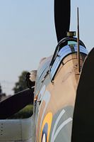 Farbfoto der Rückansicht eines Spuckfeuerflugzeugs aus dem Zweiten Weltkrieg während einer Gedenkveranstaltung in den Niederlanden.