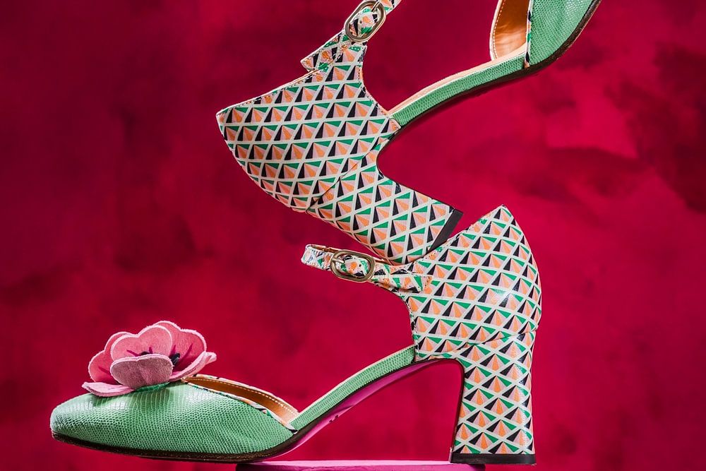 Ein lustiges und sehr farbenfrohes Bild von einem Paar Schuhe. Fotografiert auf einer rosa Säule, auf der die Schuhe zu schweben scheinen. Der rubinrote Hintergrund ist sehr schön gewählt. Das schöne Licht lässt die Schuhe aus dem Foto herausragen. Künstlerische Schuhe, die an die 1950er Jahre erinnern. Die Farben Schwarz, Rosa und Grün sind kontrastreich und hip.