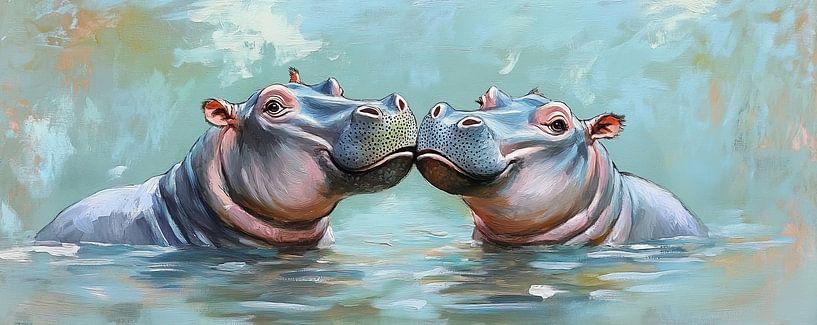 Flusspferde | Zwei Flusspferde im Garten – Auf diesem Tiergemälde sehen Sie zwei Flusspferde, die sich liebevoll ansehen, vor einem ruhigen blauen Hintergrund, der die fröhliche Sommerstimmung im Garten unterstreicht.