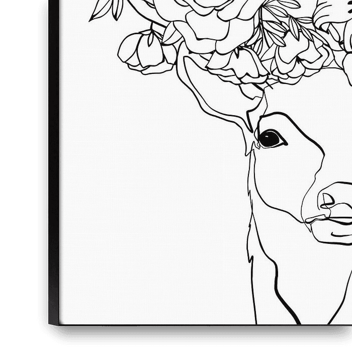 Anmutige Fusion: Eine minimalistische Linienzeichnung fängt die Eleganz eines Rehs ein, das mit Geweih verziert ist, das mit zarten Blumen blüht. Die Verflechtung von natürlicher Schönheit und dem majestätischen Reh schafft ein harmonisches und bezauberndes Bild, das die Vereinigung von Wildtieren und botanischem Charme zelebriert