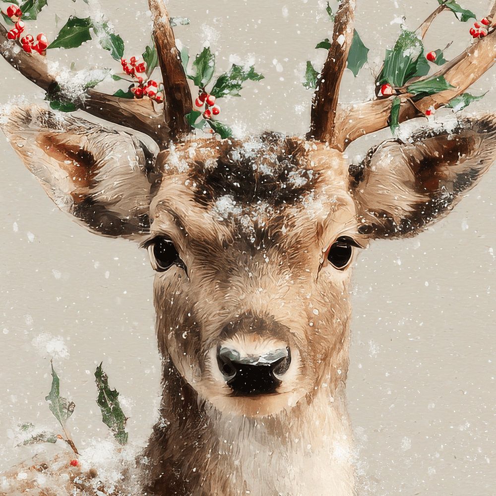 Ein bezauberndes Winterporträt eines Rehkitzes mit Geweih, das mit grünen Stechpalmenblättern und leuchtend roten Beeren geschmückt ist. Sanft herabfallende Schneeflocken verstärken die heitere und magische Atmosphäre dieser Illustration. Die feinen Pinselstriche und natürlichen Farben verleihen dem Tier ein realistisches Aussehen, während die minimalistische graue Leinwand einen eleganten, ruhigen Hintergrund bietet. Eine bezaubernde Wahl für winterliche Dekoration oder festliche Kunst mit einem natürlichen Touch.