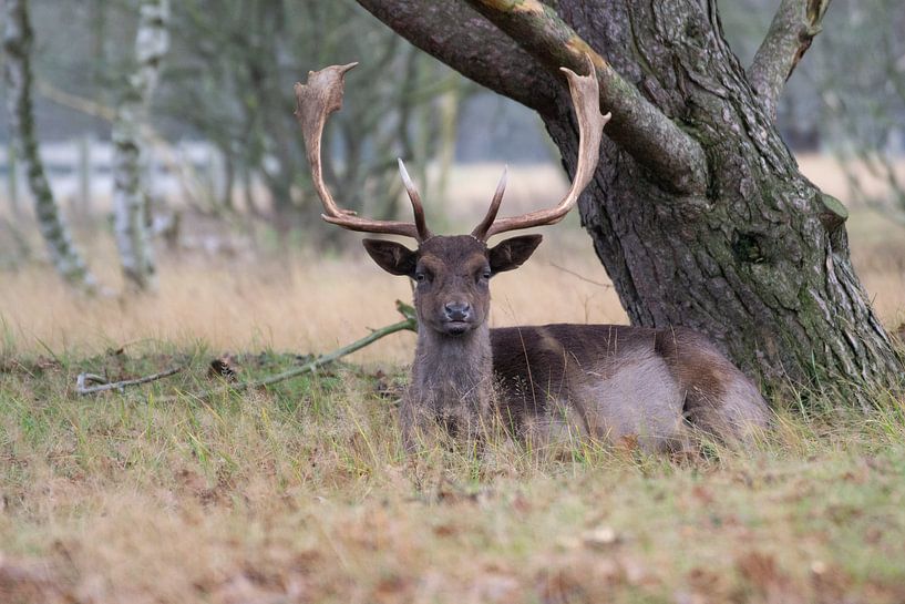 Der Hirsch ruht sich auf der Wiese unter einem Baum aus.