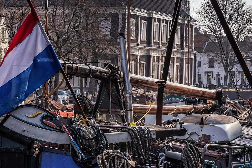 Kanal mit historischen Segelschiffen im historischen Zentrum von Schiedam (Niederlande).
