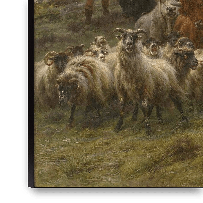 "Highland Raid" verkörpert die Fähigkeit des Künstlers, den rohen Geist von Tieren wie diesen Bullen und Schafen einzufangen, deren dicke wollige Mäntel typisch für die Hochlandviehhaltung sind. Der sinkende Himmel deutet darauf hin, dass die Hirten versuchen, dem drohenden Sturm zu entkommen, und die Herde den "Überfall" hinunter treiben, den alten schottischen für Straße.