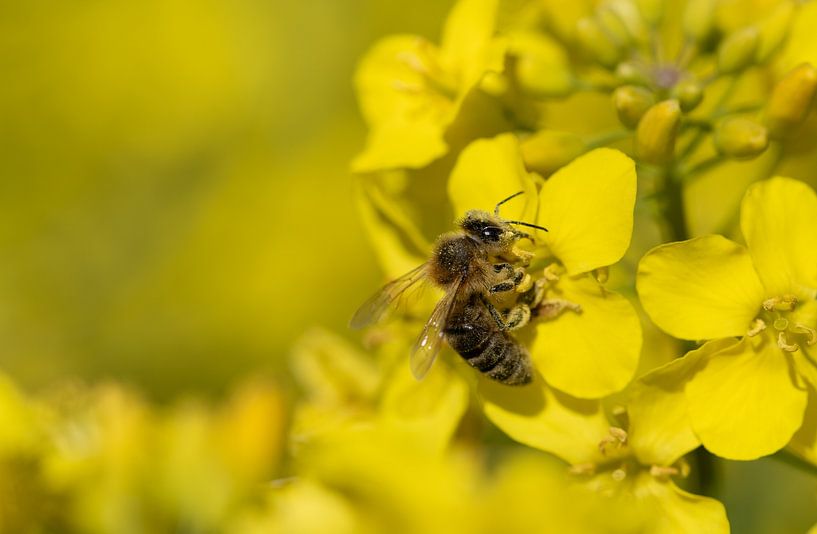 Bestelle das Foto Honigbiene und Rapsblüte von Ulrike Leone als Reproduktion auf Leinwand, Alu-Dibond, als Poster, Fototapete oder Acrylglasbild.