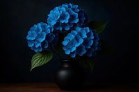 Tiefblaue Hortensien bilden volle Trauben über einer mattschwarzen Vase, die vor einem dunklen Hintergrund dezent beleuchtet wird. Das warme Holz des Tisches fügt einen sanften horizontalen Akzent hinzu, der das Bild erdet. Die Blätter zeigen feine Adern, während das Licht einen ruhigen Schimmer auf die Blütenblätter legt. Ruhe und…